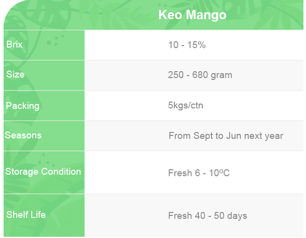 Trọng lượng từ 250gr – 680gr, Màu sắc ruột bên trong: Vàng nhạt khi sống, vàng đậm khi chín, có vị chua ngọt khác biệt so với các loại xoài nổi tiếng khác là có thể ăn từ sống đến ăn chín.